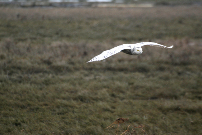 ↓バンダリーベイへ移動 今回の旅行目的の一つシロフクロウがいるといわれているところです。いましたいました、がかなり遠い・・・雨も降っています。 |