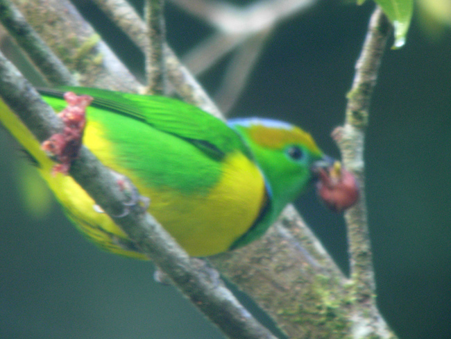 | ↓Golden-browed Chlorophonia(45-10)ズアオミドリフウキンチョウ シンチョナでこの鳥を写したかったのですが、ここでははあまり近寄せないので何とか写せたという感じです。デジスコは動きが早いのでピント合わせが間に合いません。 | ||