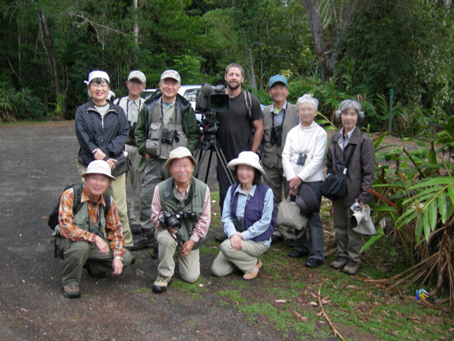 | ↓Chambers Wildlife Rainforest Lodgeでの早朝、NHKの日曜夜7:30から「ダーウィンが来た!」での動物カメラマン嶋田忠さんにバッタリ、皆さんで記念写真を撮らせていただきました。穏やかなステキな方でした。下の写真の花のところに4種類のミツスイが来ますよって教えてくださったり・・・私たちが お会いしたときはSpotted Catbrid ミミグロネコドリを写してました。来年1月頃放送とか・・・・ | ||