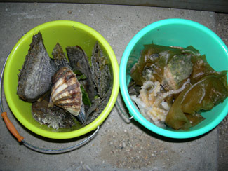| ↑姫貝、イシ貝を中心に採ってます。姫貝はプリプリとおいしです。バター焼き最高です。 | ↑愛媛県から来られた御夫婦です。イイダコ31匹とっています。 | ||
