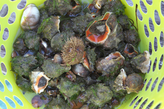 | ↓ヒメガイも少し掘られたようです。右も同じ方の成果ですが、貝を洗うためザルに移したところです。 | |||