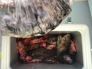 | ↑ジャスト30cmのメバルはデカイです!! | ↑竿頭さんのクーラーに良型23〜30cmが10匹混じってました。 当船オリジナルサビキで大型が釣れました!! |