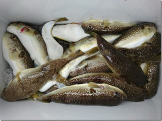 | ショウサイフグ朝から当り連発!! 入れ食いにはなりませんが、適度に皆さん釣れてました、少し少ない人も居ますが皆さん20〜35匹は釣れてた思います。2号艇船長先日の夜から体調不良で今日は出船出来ないかと思いましたが、夜間の診療で点滴と薬で復活(^_^.) 元気だけがとりえなのですが・・・皆さんにご迷惑をかけずにすみましたm(__)m | |